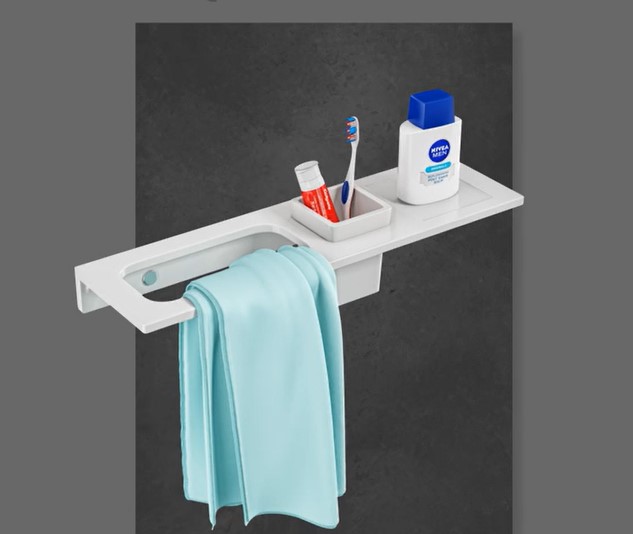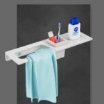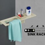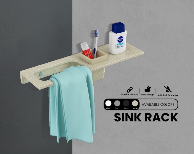 Stylish wall-mounted sink rack, designed to hold soap, toothbrushes, and a face towel with ease. Finished in luxury, rust-proof, and fade-resistant—ideal for moisture-rich environments.